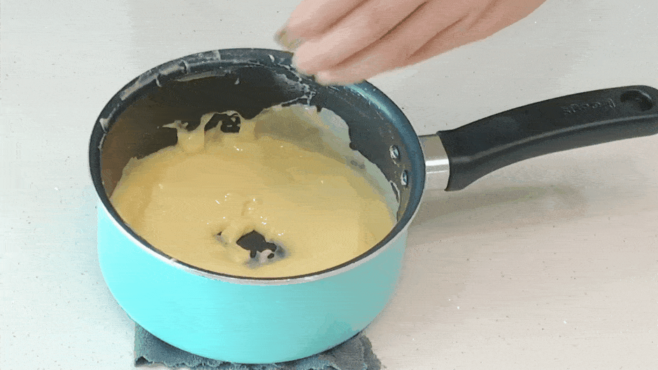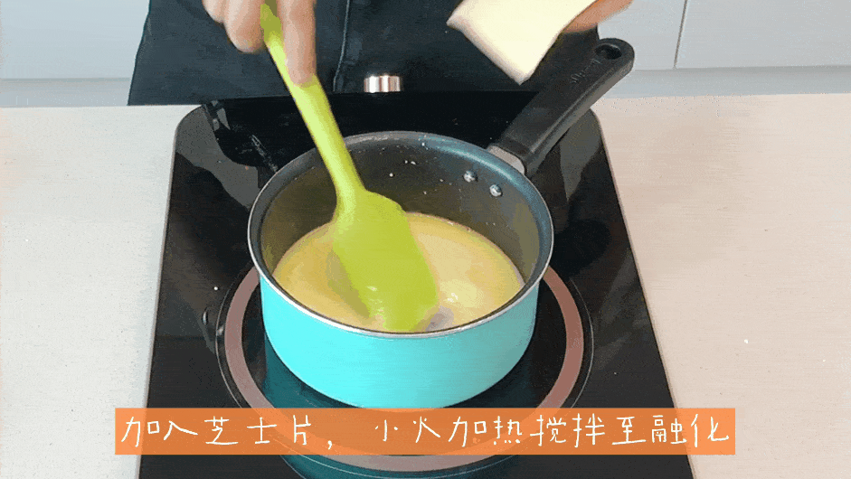 「3」加入芝士片,小火加熱並不斷攪拌,至芝士片完全融化。
