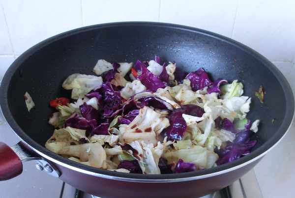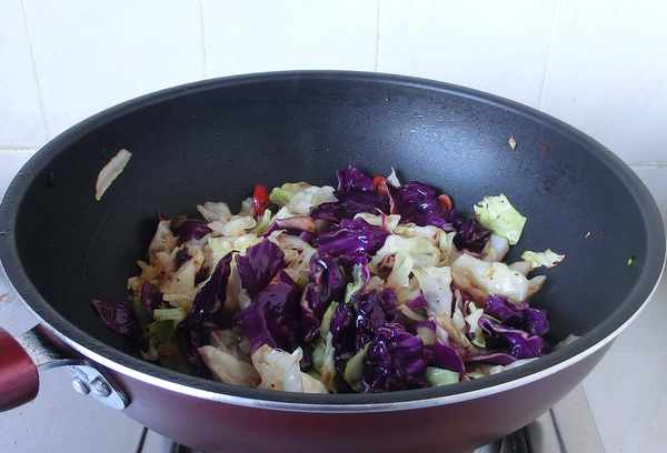 3.放入甘藍菜後要開大火快速翻炒,既能保證營養不流失,又讓甘藍菜入口更脆。