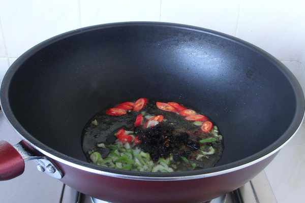 3. 熱鍋冷油,鍋裡加油燒熱後,加入蔥末、小米椒、豆豉香辣醬炒香。