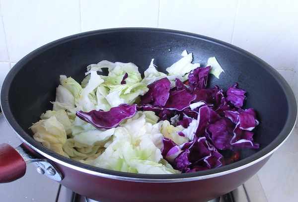 4. 倒入甘藍菜,炒至斷生後,調入料酒,繼續爆炒,讓香味都進入包菜