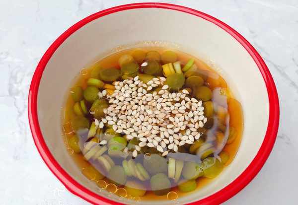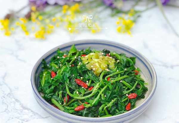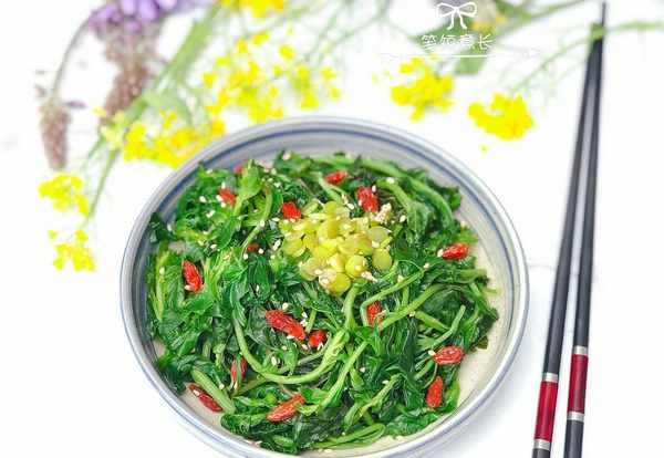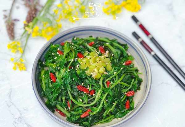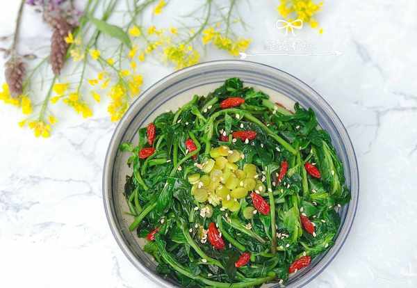 5、將蒜苔洗凈後切碎,和白芝麻一起放入調料碟,淋入一勺熱油烹出蒜香味兒,隨後依次添加2勺生抽、1勺香醋、半勺白砂糖和香油後攪勻,枸杞芽中放幾顆提前用溫水泡發軟化的枸杞,淋入調好的料汁兒後翻拌均勻,鮮嫩美味的涼拌枸杞芽就做好瞭。怎麼樣?做法是不是超簡單?聰明如你,一看就會。有時間也為傢人做一道愛心牌的【涼拌枸杞芽】吧,再簡單的食材浸潤瞭愛的味道也會變得更加美味哦!