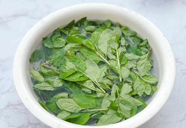 2、將枸杞芽用清水淘洗幹凈,洗菜盆內接入適量清水後放一勺食鹽,攪拌至鹽融化後將枸杞芽浸泡幾分鐘,可以幫助去除葉片上的細菌和小飛蟲。
