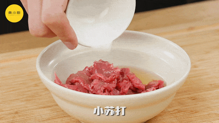 牛肉切成條,放入碗中;加入小蘇打、糖、鹽、生抽、淀粉攪拌均勻;蝦去頭,剝殼取出蝦尾;加入白胡椒粉、料酒醃制