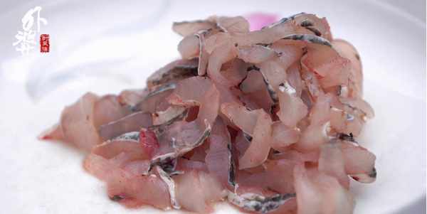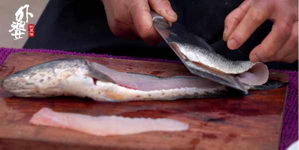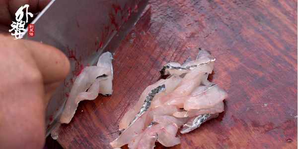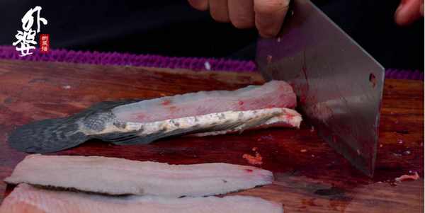 黑魚肉肉質緊實,沿著魚身脊骨片下兩大片魚肉後,就可以把魚肉切薄片瞭。魚肉片不能切太薄,否則翻炒的時候容易碎裂。
