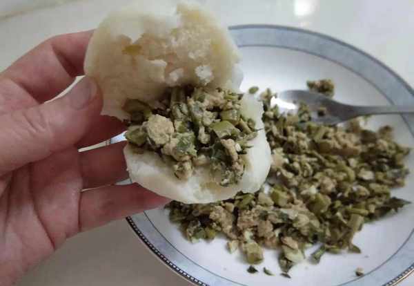 4、把饅頭掰開,放上香椿炒雞蛋,好吃,好香,人間美味。