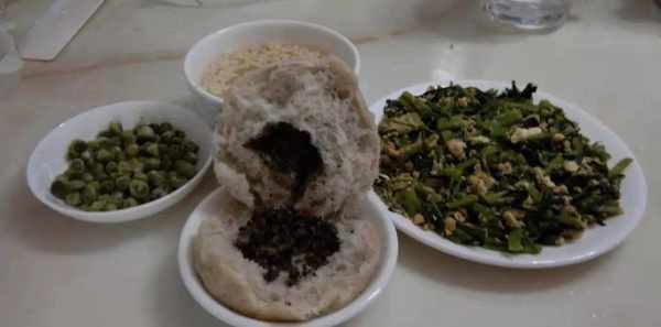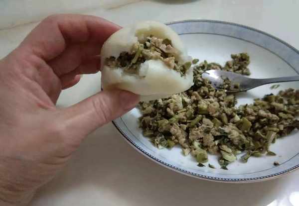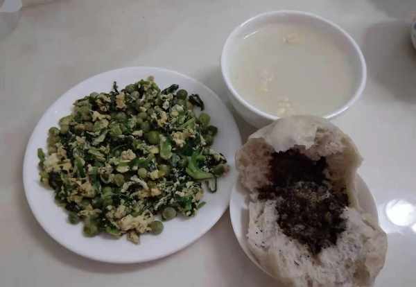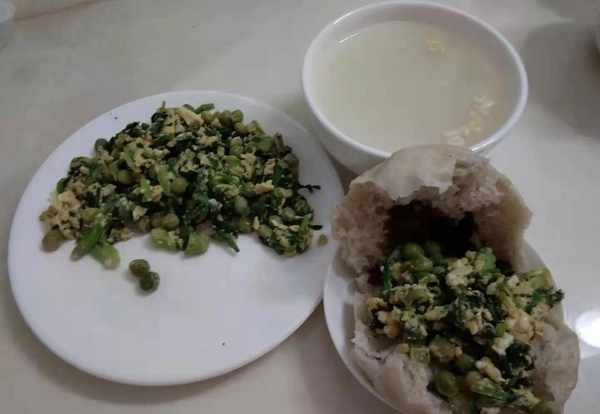 吃早餐,薺菜炒雞蛋夾饅頭。