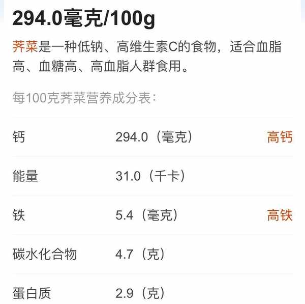 薺菜含鈣量見下圖,每100克薺菜含鈣294毫克,每100克牛奶含鈣量為104毫克。