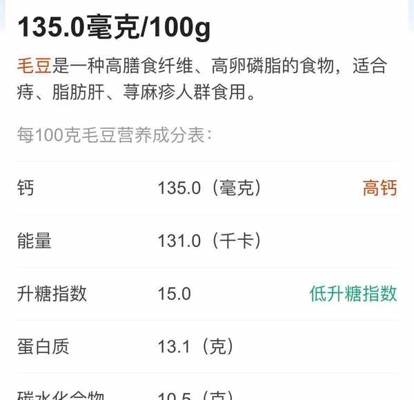 毛豆含鈣量見下圖,每100克莧菜含鈣135毫克。