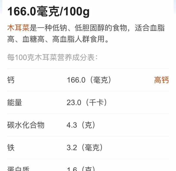 木耳菜含鈣量見下圖,每100克木耳菜含鈣166毫克。