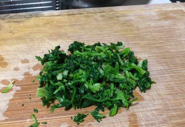 1、從冰箱取出速凍薺菜,用水沖一下馬上用刀就可以切瞭,把薺菜切成短段。