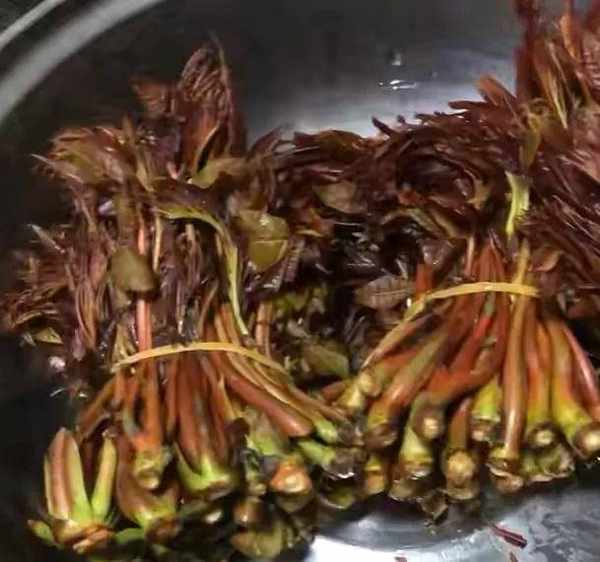 3、計時10分鐘到瞭,放入香椿,再燉炒2分鐘,收汁,放點鹽,翻炒均勻,關火盛盤。