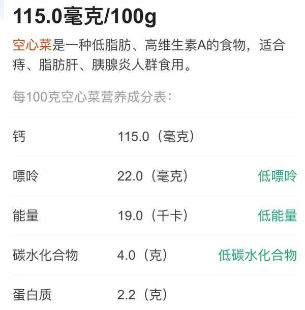 空心菜含鈣量見下圖,每100克空心菜含鈣115毫克。