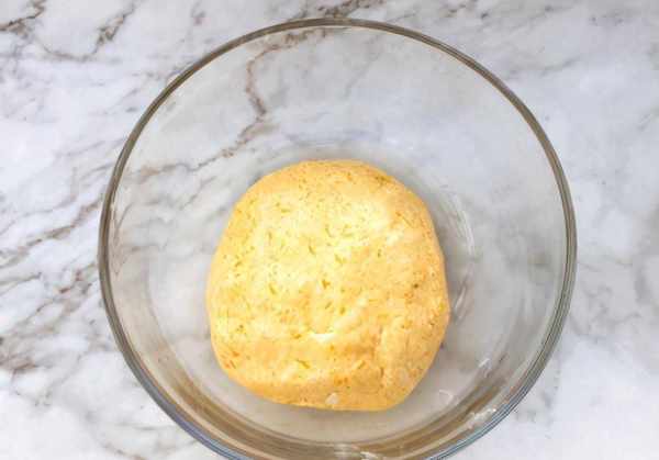 第二步,糯米粉和奶粉事先混合,過一遍篩子,將其加入在紅薯泥中,先攪拌成絮狀,再用手揉成一個光滑且不粘手的面團,在案板撒上少許的糯米粉;