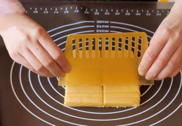 第三步,將面團放在案板上,用搟面杖搟成1厘米厚的長方形面片,邊緣處修整齊一些,用刮刀將面片切成條,粗細長短要一致,同時準備出適量的白芝麻;