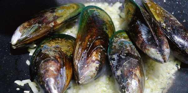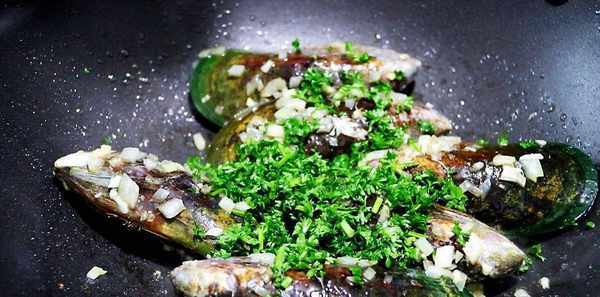 待鍋內的食材炒出香味後,放入準備好的青口貝,翻炒幾下。
