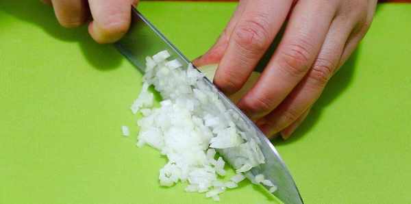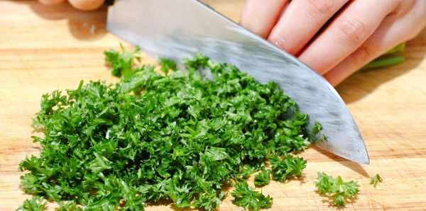 洗凈歐芹後,用刀切成碎末,洋蔥切成細末,大蒜切成碎末。
