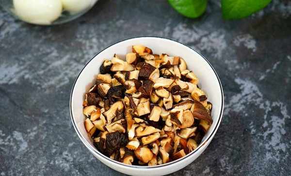 泡好的香菇切小丁,泡菇的水也別倒掉
