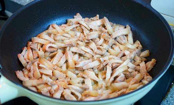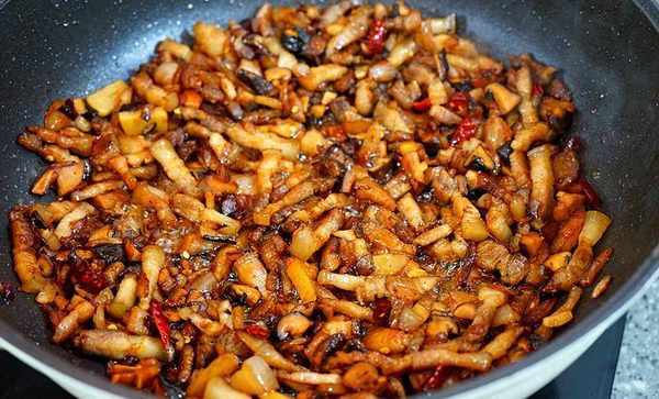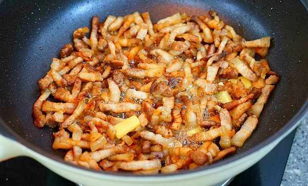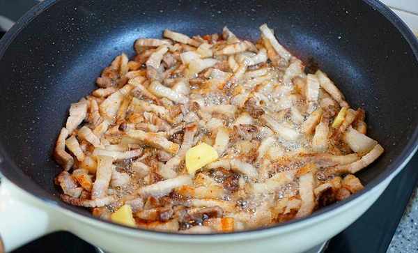 鍋裡重新倒油,切好的小肉塊兒丟進去,慢慢煸炒出油