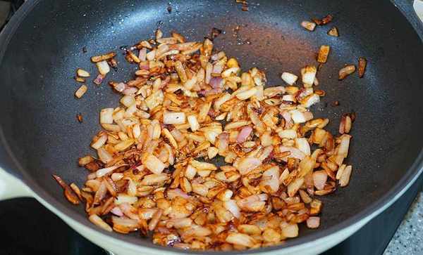 現在我們來做洋蔥酥:鍋裡上油,切好的洋蔥碎倒進去 中小火不停的翻炒