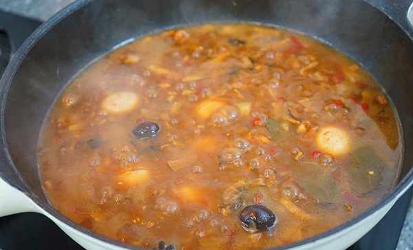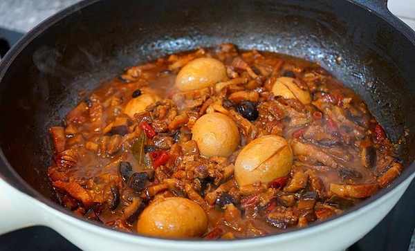 剛剛煮肉的水和泡香菇的水可以倒一些進去,肉湯一定要沒過肉,當然啦可以稍微多一些,我吃的時候喜歡肉湯多一點可香瞭
