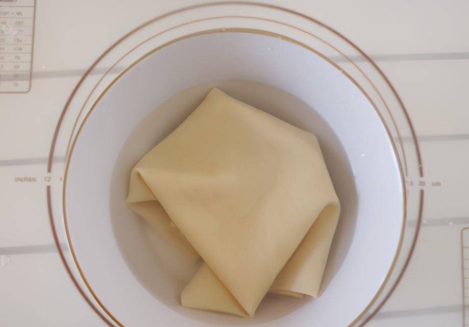 制作過程:第一步,豆腐皮2張,放開水鍋中焯燙下,撈出來後過一遍涼水,將豆腐皮快速降溫變涼,豆腐皮控水後切成絲,可以稍微粗一點要粗細均勻;