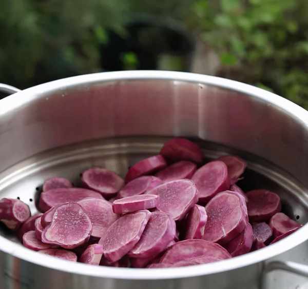 紫薯片上蒸鍋,大火燒開後繼續蒸20分鐘,直至熟透即可。