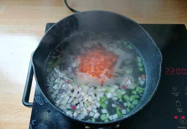 按照口味加入適量的低鹽生抽,混合均勻。米飯裡加瞭彩色的蔬菜丁,看起來很有食欲。