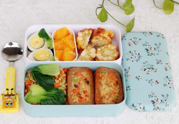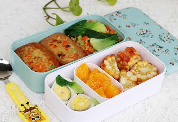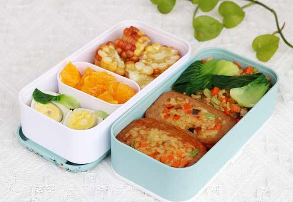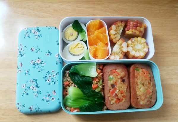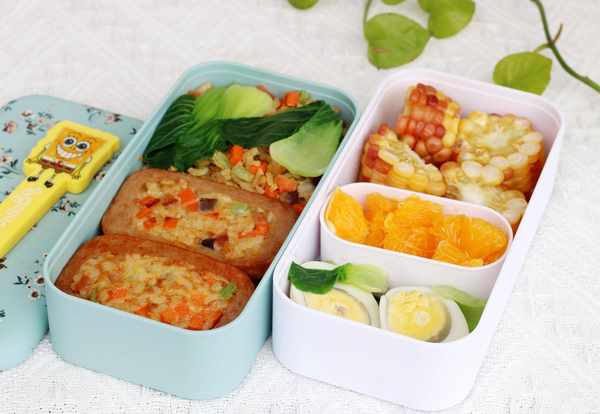 煎好的午餐肉蔬菜丁米飯放進飯盒裡,另外一部分蔬菜丁米飯和上海青也放進飯盒裡。水煮的雞蛋剝殼對半切開,臍橙剝皮切成小塊和玉米一起放進飯盒裡,一份營養早餐就做好瞭。