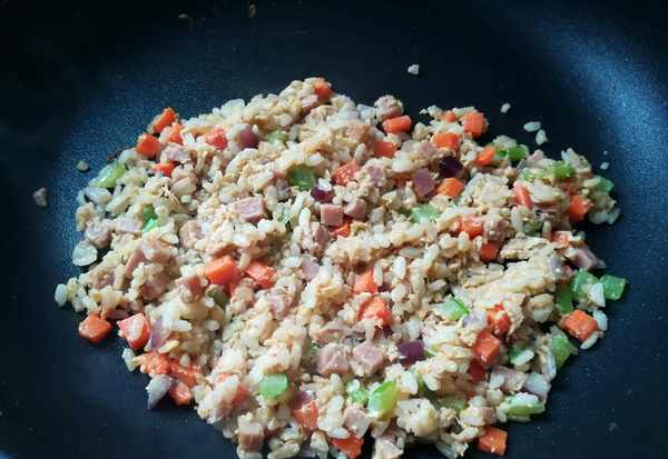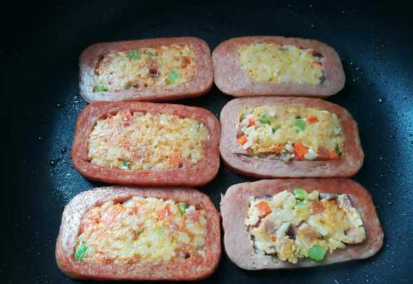 第六步:大火燒熱油鍋,放入適量的食用油,挖空的午餐肉放入鍋裡,中間放上混合好的蔬菜丁米飯,煎到兩面微微焦黃盛出來。