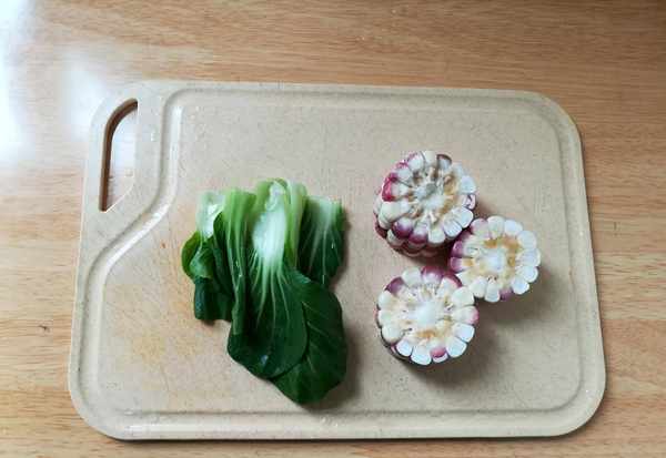 第一步:玉米清洗幹凈切成小段,上海青洗幹凈瀝一下水分,青菜可以換成生菜或者其他綠色蔬菜。