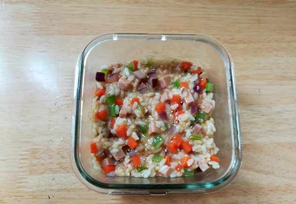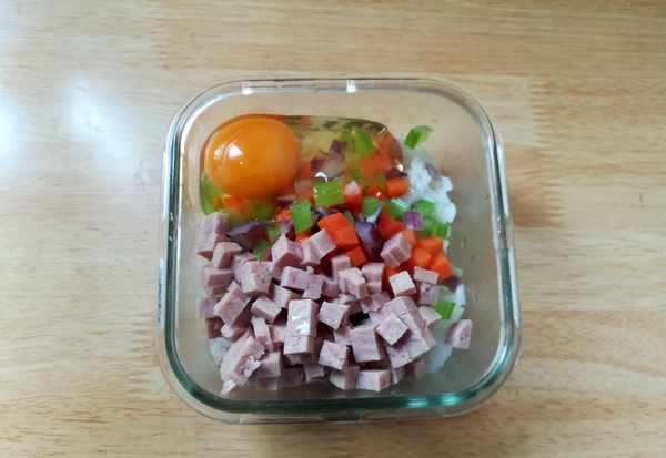 第五步:碗裡放入米飯,焯過水的蔬菜丁,一個生雞蛋和切碎的午餐肉。