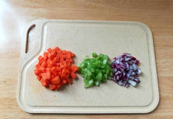 第二步:煮玉米的時候,把洋蔥切成丁,西芹切成丁,胡蘿卜削皮切成丁。