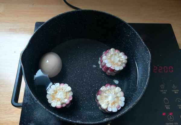 雞蛋用水洗幹凈,其中一個雞蛋跟玉米一起冷水進鍋煮開後煮8分鐘。