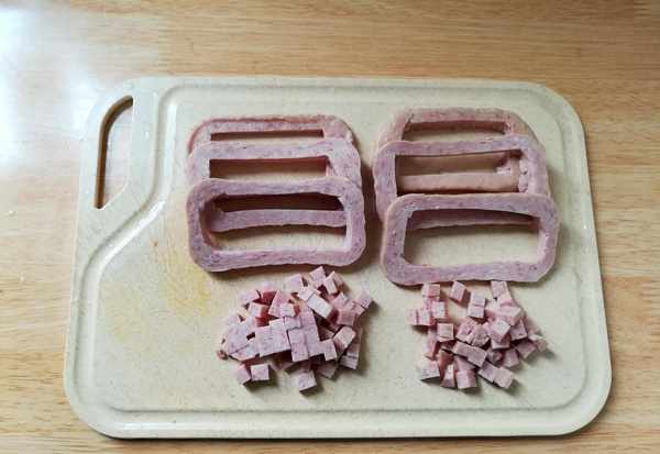 第三步:午餐肉切大約1厘米的厚片,用水果刀把中間的部分挖出來,切成小丁。午餐肉挑選好一些的品牌,淀粉添加相對來說少一些,不建議用火腿腸代替。