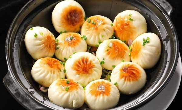 4、平底鍋裡刷上食油,將包子都放入裡面,中火將包子底部煎至金黃,倒入調好淀粉水,蓋上蓋子中火,煮至水幹,包子就熟瞭,再撒上些蔥花即可。