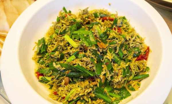 韭菜炒槐花口感香咸,清甜好吃。