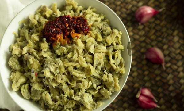 3、將蒸熟的槐花舀到盤子裡,配上剛才調好的料汁就可以吃瞭。
