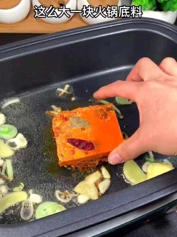 2、將蔥薑蒜放入鍋中,小火煸炒炒出香味,然後放入火鍋底料開小火煸炒,直至火鍋底料半化開。