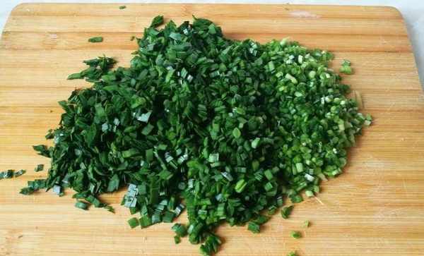 3.韭菜清理幹凈切去根部,放小蘇打浸泡20分鐘左右,再次清洗控幹水分,切成碎末(韭菜根部容易生蟲,所以種韭菜會澆農藥,韭菜生長周期短,根部就很容易有農藥殘餘)