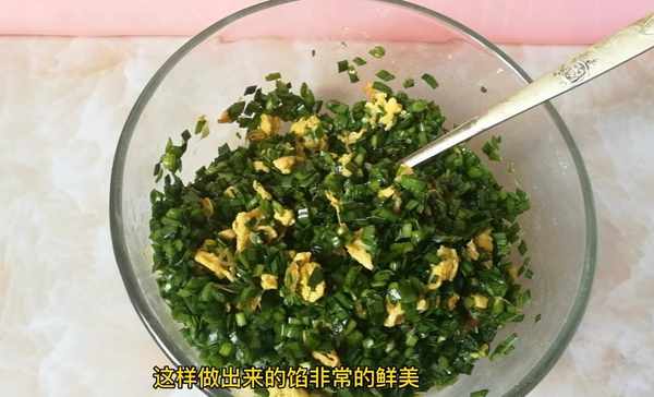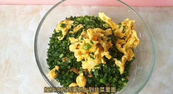 5.調餡,韭菜碎裡倒入晾涼的雞蛋,加一勺半生抽,加適量2克食鹽(不需要過多調味料,做出來的餡鮮香味美)