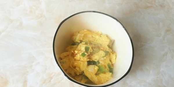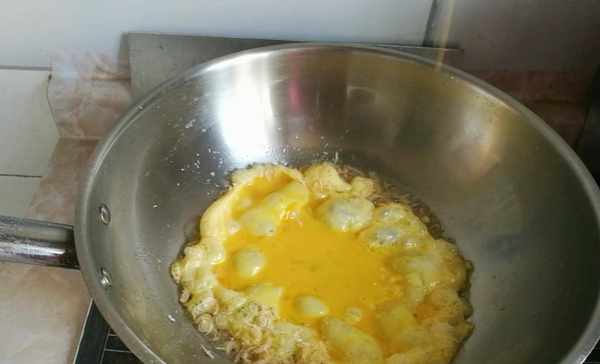 3.鍋內放蔥油,油熱後倒入攪散的雞蛋液,撒蝦皮和蔥花,迅速滑散,盛出備用(蛋液裡加少許清水,炒出來的雞蛋更嫩,蝦皮炸出來的味道更香,沒有腥味)