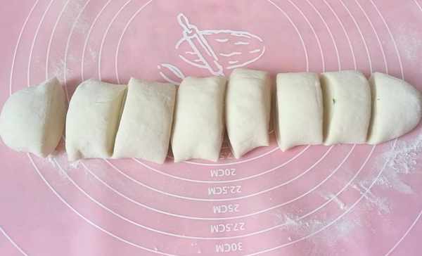 4.發好的面揉搓排氣,搓成長條,分成大小均勻的劑子
