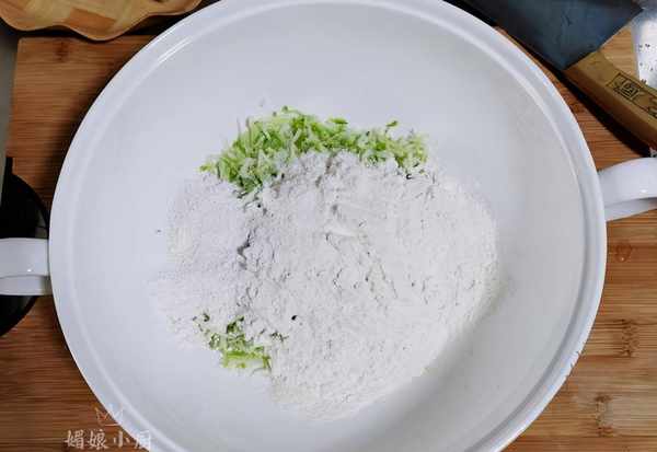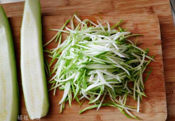 1、西葫蘆洗凈豎向切成4半,切除籽瓤(也可不去,隻是軟塌塌的沒口感),擦成細絲,再略微切幾刀,西葫蘆絲稍微變短一點,裝入大碗裡