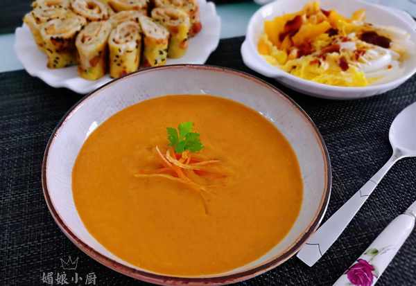 南瓜濃湯做過好幾個配方的,加淡奶油,加牛奶,最後我還是喜歡隨意搭配蔬菜隻加鹽和黑胡椒調味這款。