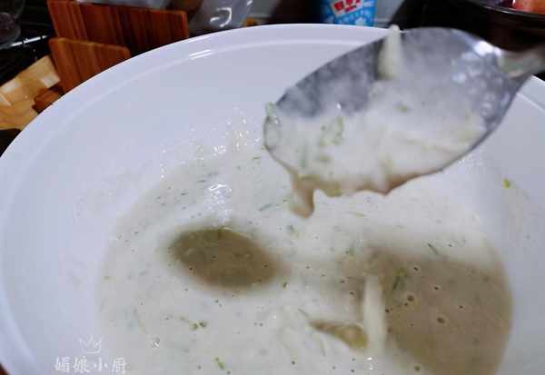 3、分次加入清水,邊用勺子攪拌成比酸奶略微稀薄的均勻面糊,勺子舀起面糊能很順暢地流下狀態