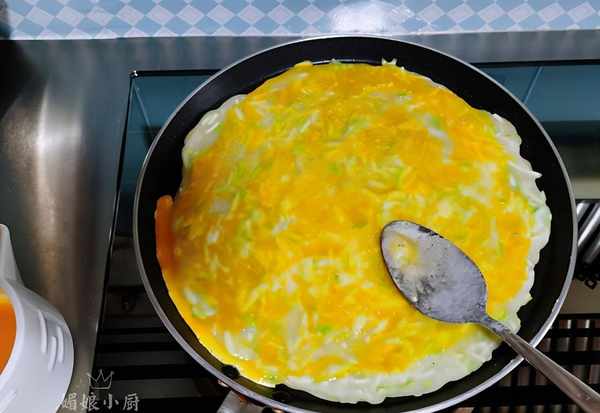 6、倒入一半的蛋液,同樣用勺子底將蛋液抹開抹勻,盡量鋪滿整個餅面