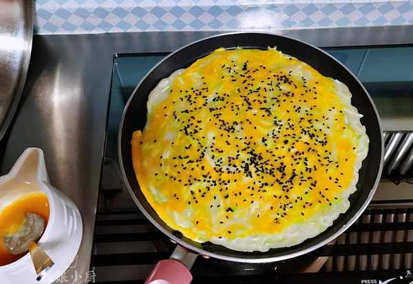 7、撒上黑芝麻點綴,也可增加香味,蛋液凝固,黑芝麻粘牢在蛋液上,翻面,蓋鍋蓋再煎2分鐘