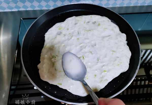 5、煎鍋刷油,倒入一半的面糊,用勺子底將面糊抹開攤滿鍋底,蓋鍋蓋小火煎2分鐘,面糊凝固
