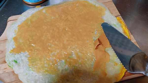 8、煎好的雞蛋餅取出,有雞蛋芝麻那面朝下放置案板上,在餅面上薄薄地抹一層花生醬