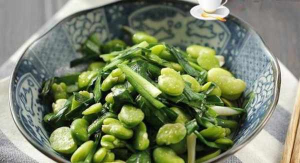 2,鍋裡燒熱油,放入蒜末,爆出香味,加入蠶豆米炒熟,然後加入韭菜,翻炒幾下斷生,最後放入少許鹽調味,即可出鍋裝盤。